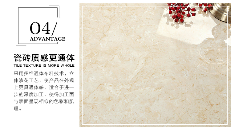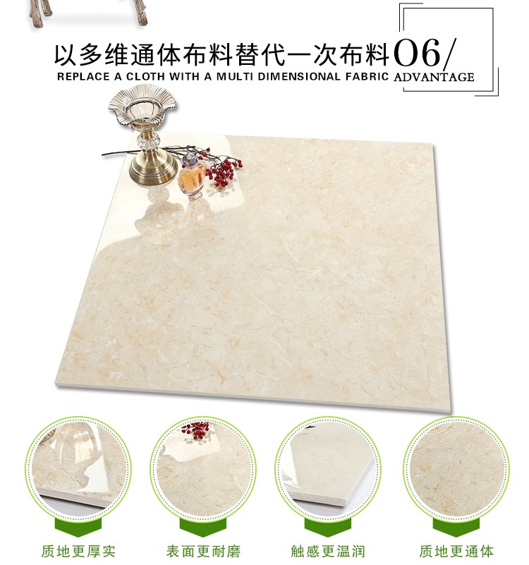 瓷拋磚,是陶瓷墻地磚的創(chuàng)新品類之一,其表面為瓷質(zhì)材料,經(jīng)印刷裝飾,高溫燒結(jié),表面拋光處理而成。與表面為玻璃質(zhì)材料的陶瓷墻地磚相比,具有更高的耐磨特性,質(zhì)感更加溫潤,紋理更加自然而逼真,適合各類建筑物的內(nèi)外墻地裝飾。