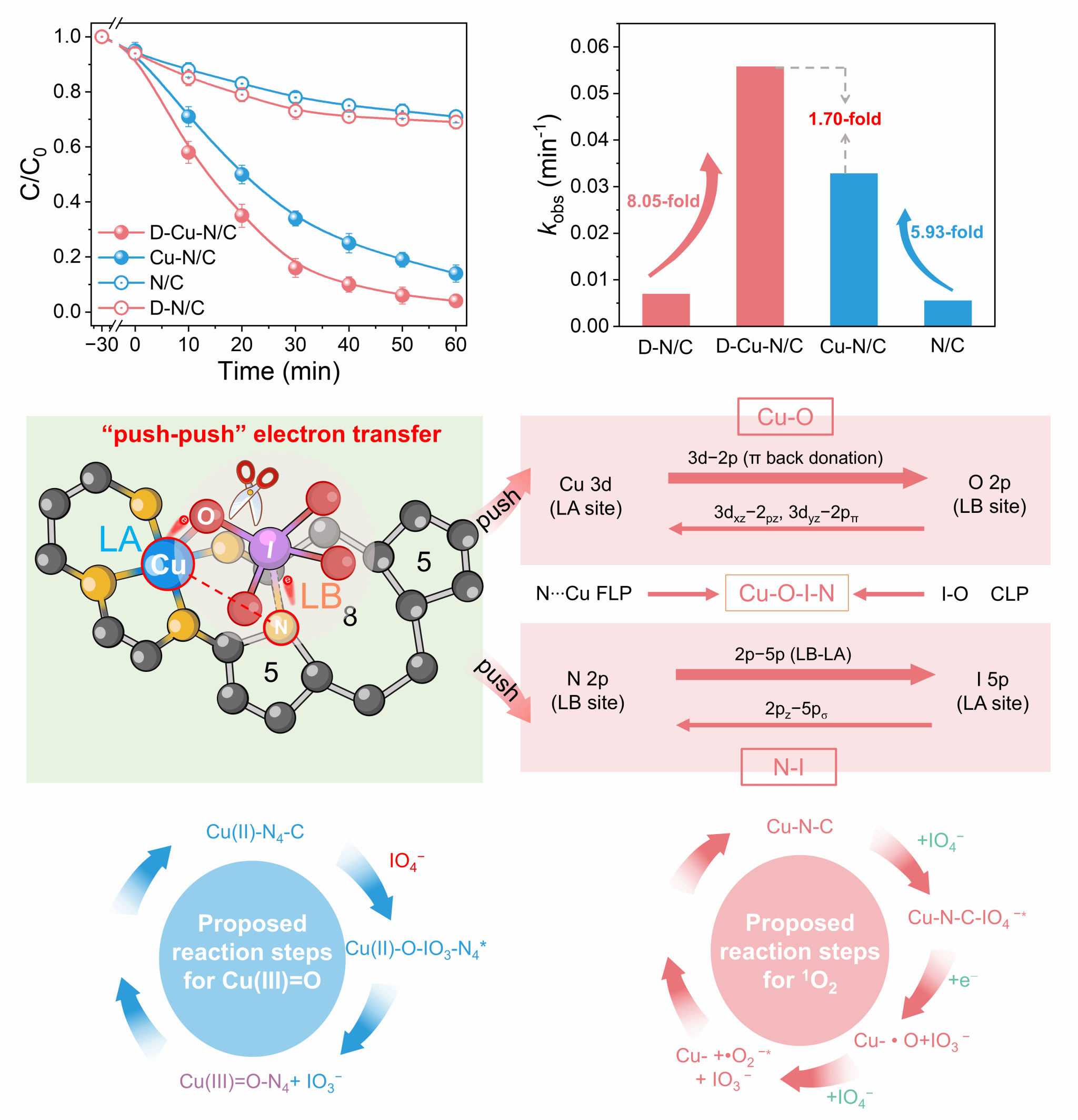 在本研究中,团队巧妙设计了一种缺陷调制的铜单原子催化剂(D-Cu-N/C),在碳基体中构建了空间分离、电子耦合的“固体受阻路易斯对”(FLP)。其中,Cu-N4作为路易斯酸位点,缺陷锚定的吡啶氮作为路易斯碱位点,形成独特的“推-推”电子接力机制。该结构能够协同活化高碘酸盐(PI),同步生成高价Cu(III)=O物种和1O2,实现了双通道非自由基氧化。