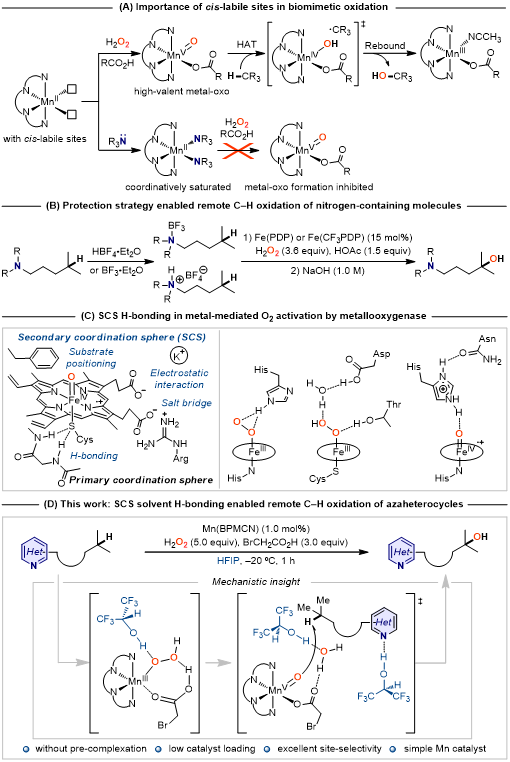 受金属加氧酶次级配位环境中的氢键启发,王斌教授课题组报道了一种次级配位环境的溶剂氢键策略,以六氟异丙醇(HFIP)作强氢键供体溶剂、廉价易得的非血红素锰配合物作催化剂,H2O2作氧源,在不需要强Lewis酸或Brønsted酸对碱性氮原子进行预先保护(图1C)的情况下实现了含氮分子中远端非活化C(sp3)‒H选择氧化(图1D)。反应机理研究表明含氮分子与HFIP之间存在强氢键,避免了催化剂因氮配位而失活,并使碱性氮原子和邻近氮原子的α-C–H去活化。此外,HFIP所产生的氢键不仅可以促进MnIII-OOH的O−O异裂生成MnV(O)(OC(O)CH2Br)作为活性中间体,还可以显著提高MnV(O)(OC(O)CH2Br)的稳定性、使得MnV(O)(OC(O)CH2Br)在C–H羟化中的活性在氢原子摘取步骤中降低,而在氧反馈步骤中提高。