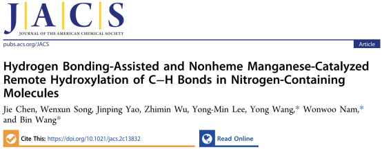 近日,WilliamHILL中国王斌教授课题组与宁波大学王永教授、韩国梨花女子大学Wonwoo Nam教授合作在国际化学领域权威期刊《美国化学会志》(J. Am. Chem. Soc. 2023, DOI: 10.1021/jacs.2c13832.)发表了题为“Hydrogen Bonding-Assisted and Nonheme Manganese-Catalyzed Remote Hydroxylation of C‒H Bonds in Nitrogen-Containing Molecules”的研究论文。