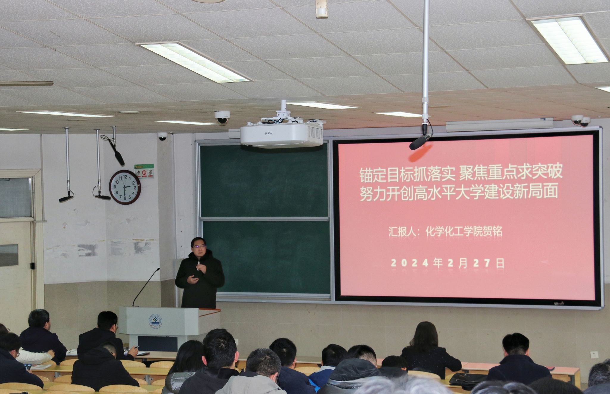 贺铭带领全体教职工共同学习学校党委书记刘春华在学校四届四次全委会扩大会议上作的题为《锚定目标抓落实 聚焦重点求突破 努力开创高水平大学建设新局面》的工作报告,并结合学院实际,围绕“七个聚焦聚力”对学院2024年的重点工作进行了细致部署。贺铭强调,2024年是全面贯彻落实党的二十大精神的关键之年,也是实现学校第四次党代会和“十四五”规划目标的关键一年,全体教职工要抢抓机遇,奋楫争先,聚焦主责主业,发扬实干精神,做好学校发展工作大局中的“催化剂”。